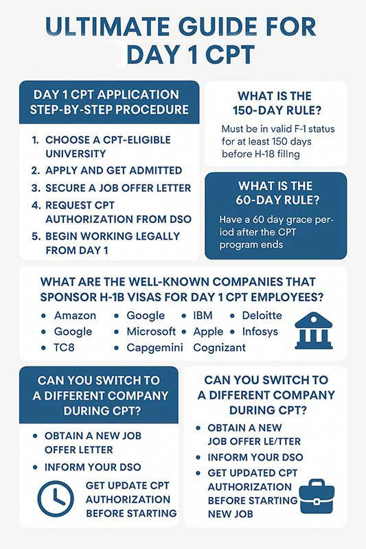 Day One CPT (Curricular Practical Training) is becoming an increasingly popular option for international students in the United States, especially those pursuing graduate programs while looking to gain immediate work experience. This guide will walk you through the key details of Day 1 CPT, the application process, important immigration rules like the 150-day and 60-day rules, and how it relates to H1B sponsorships and job flexibility.
